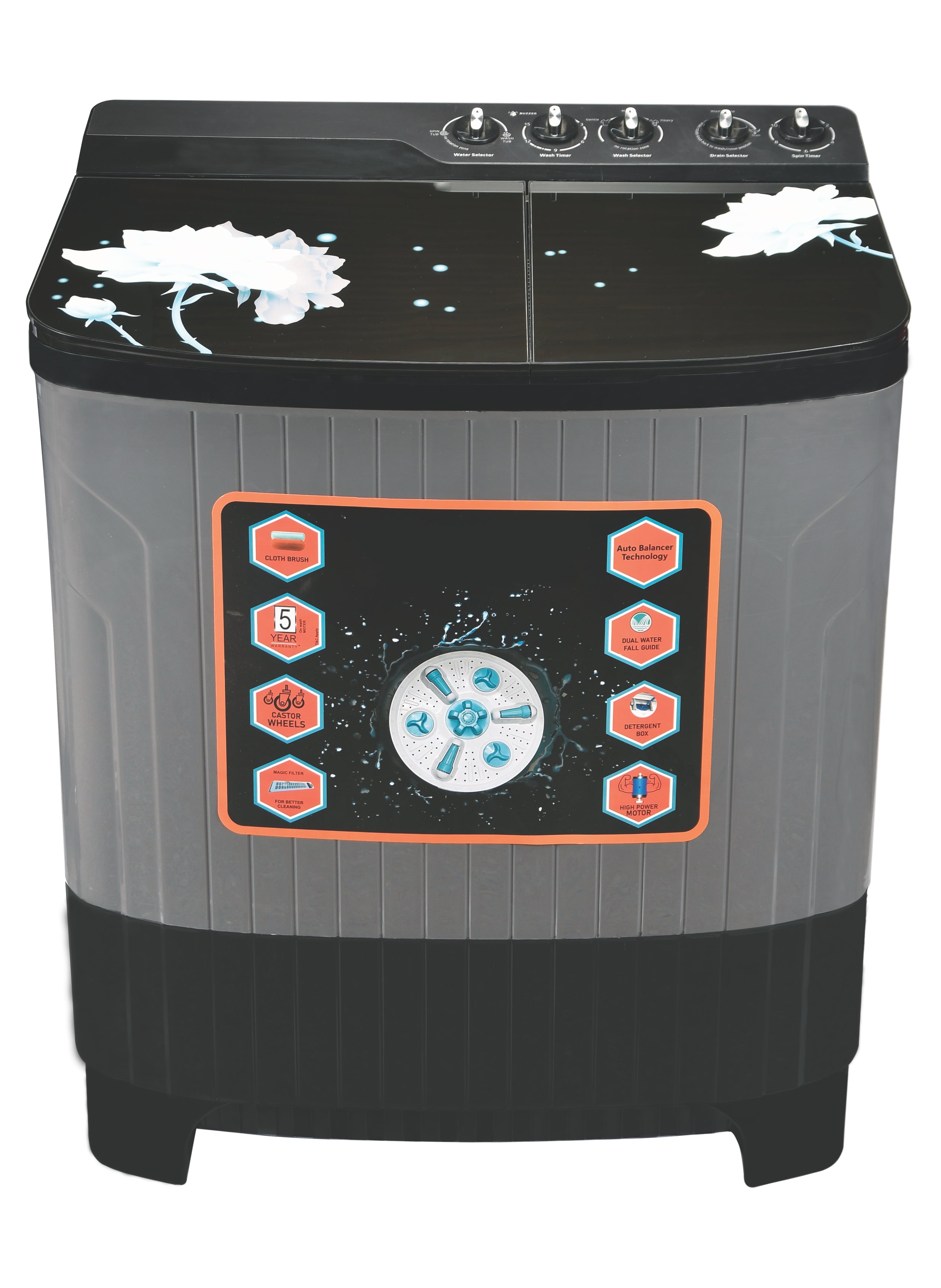 Constructed with a durable PPCP body and toughened top, it ensures longevity and resilience. Featuring a powerful 150W motor for washing and a 60W motor for spinning, this machine delivers effective cleaning with every cycle. The 220V~230V AC 50Hz supply ensures reliable operation.